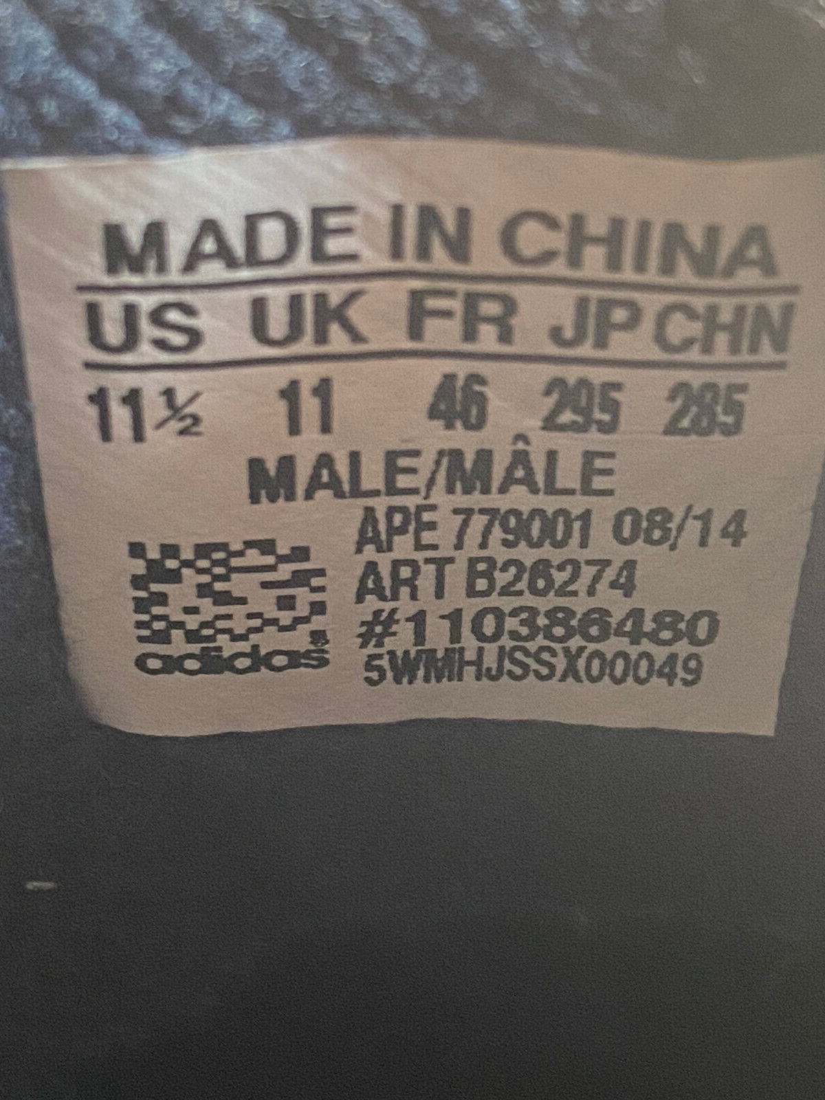 The shoes are used/worn, fits like US-size 12, have signs of wearing and using and comes including for extra apairs of laces, new insoles in the original Adidas-box.