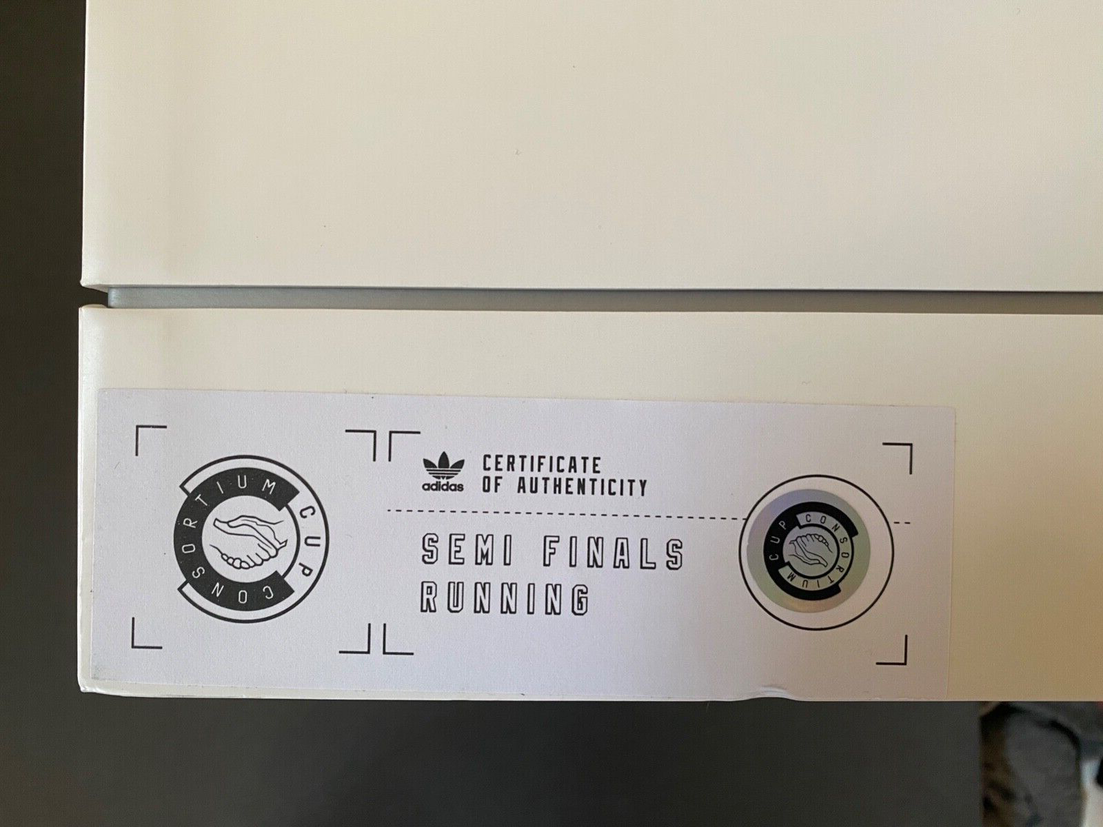 Die Schuhe sind neu und werden inklusive zwei Paar extra Schnürsenkel in der original Adidas-Consortiumbox versandt.