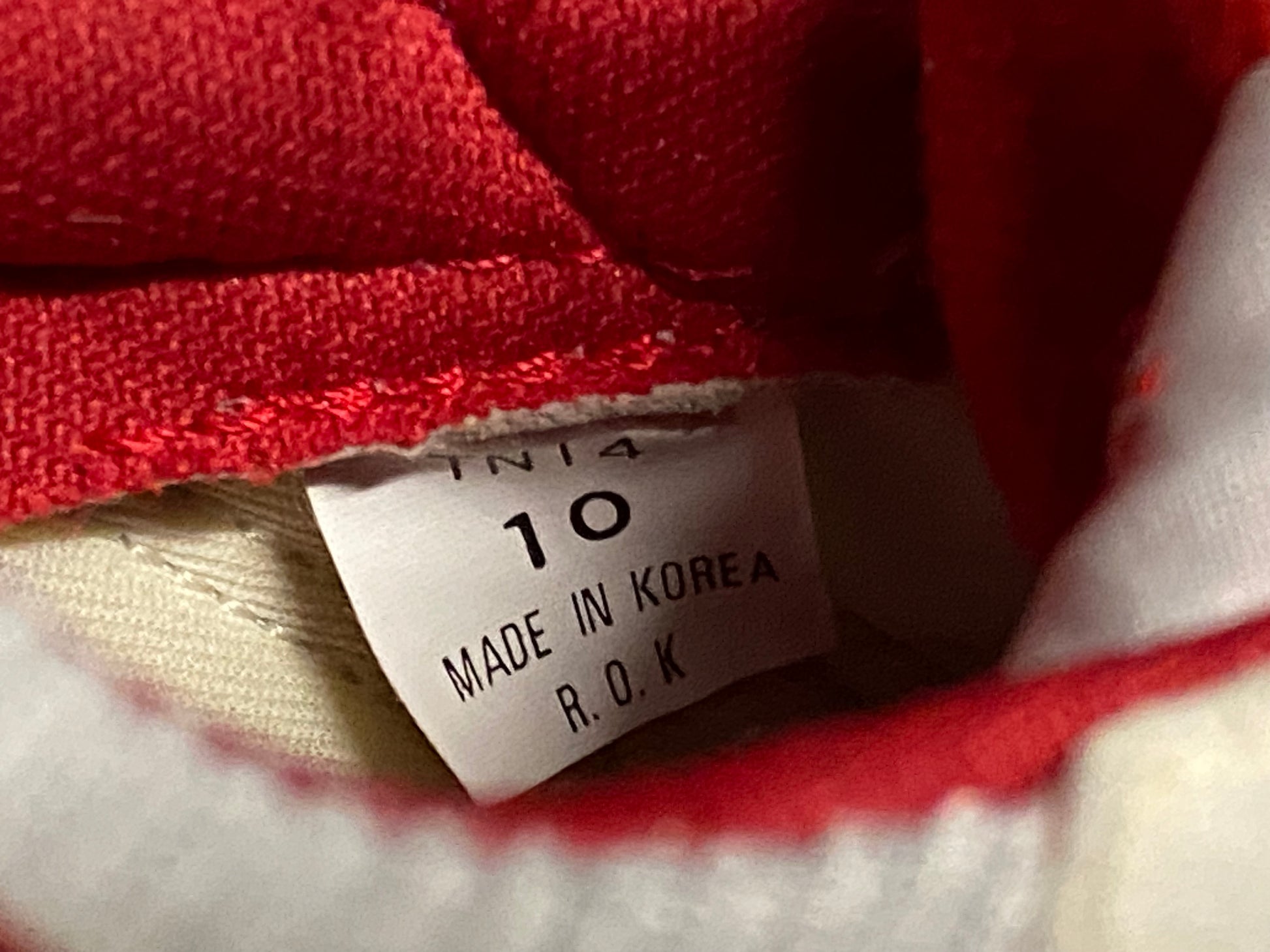 The shoes are new and vintage, so they have many age marks, like yellowed glue stains, storage damages, crackling/crumbling/sticky Asics-stripes etc. and they´re comes without original box, but including the original vintage shoe bag..