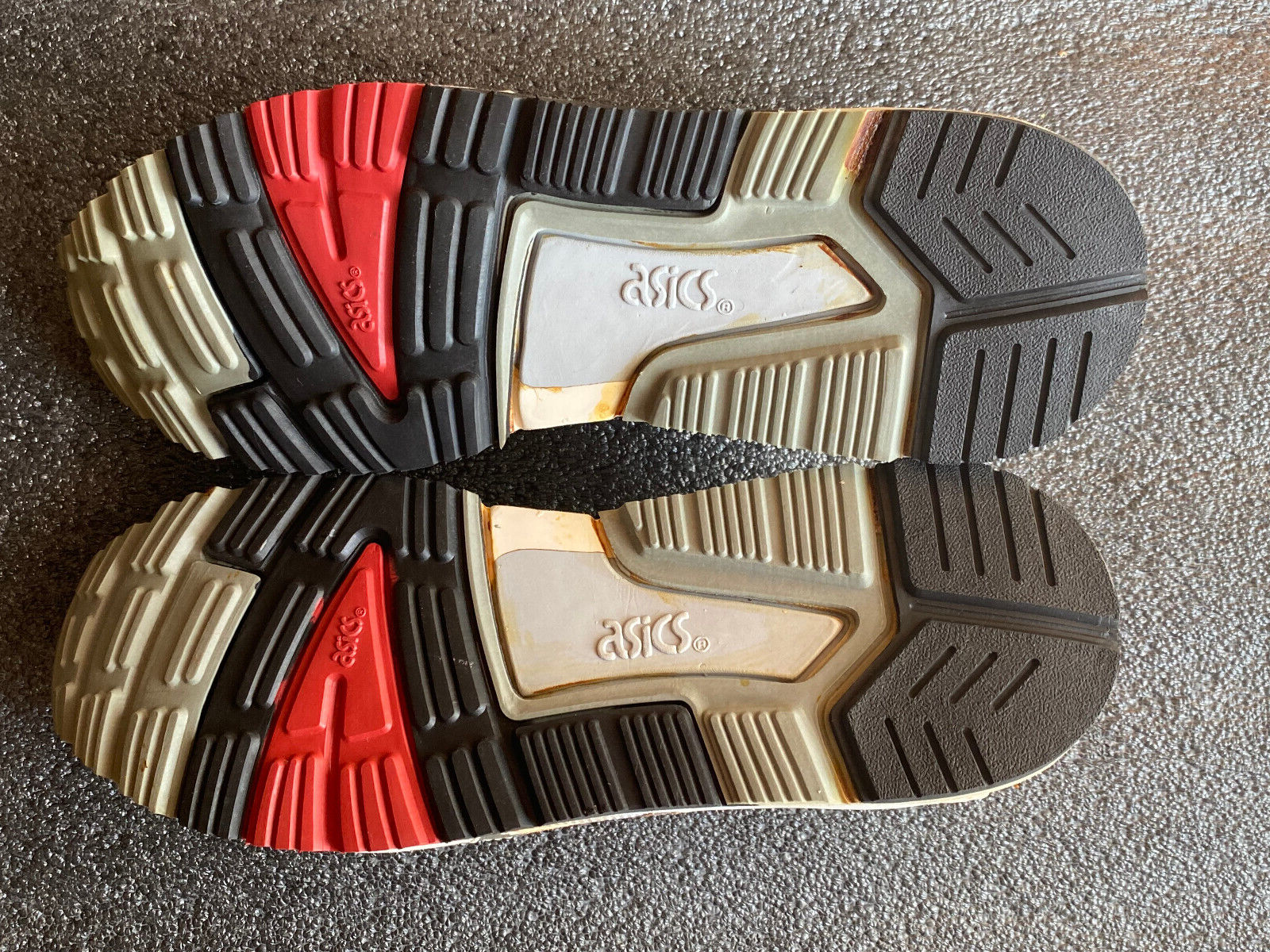 The shoes are new and vintage, so they have many age marks, like yellowed glue stains, storage damages, crackling/crumbling Asics-stripes etc. and they´re comes without original box.