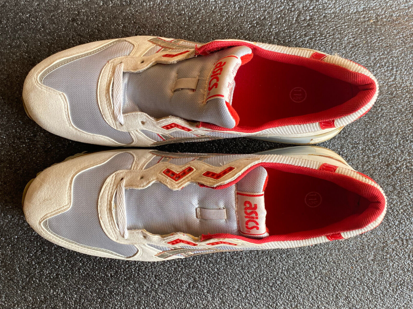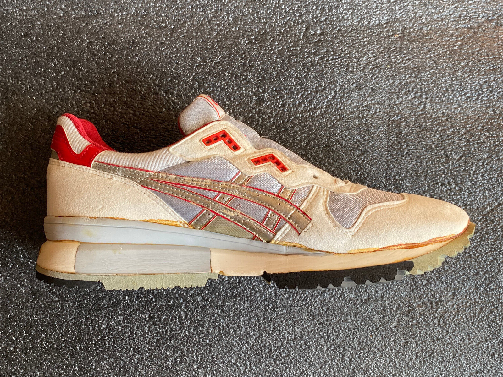 Diese Asics-Schuhe hatten im Fersenbereich unter der Mittelsohle einen sichtbares Gel-Kissen (siehe Bild 8)!  Die Schuhe sind neu, weisen aber Alters- u. Lagerungsspuren auf, wie z.B. vergilbte Klebeflecken, Farbab- u. aufrieb, poröse/brüchige Asics-Streifen etc., da es sich um Vintage-Schuhe aus den 80er Jahren handelt und werden ohne original Box versandt.