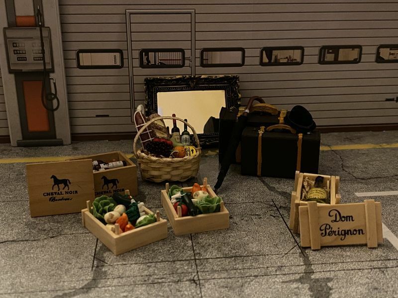 Gemüsekisten Champagner Wein Spiegel Koffer Schirm Hut Präsentkorb Diorama 1:12