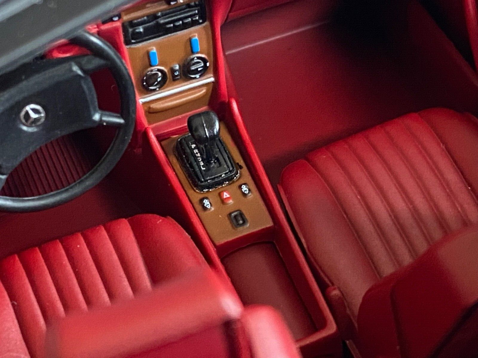 Das Modell (aus Metall gefertigt, Türen und Hauben zu öffnen, sowie das schwarze Softtop abnehmbar) wurde auf US-Version (Scheinwerfer, Rückleuchten, Stoßstangen etc.), Automatik (Automatik-Wahlhebel, siehe Bild 9) plus passender Pedalerie, sowie dem Motor aus dem 450 SL (siehe Bild 10) und auf Fuchs-Felgen "Barock" (weiterhin dreh- u. lenkbar) umgebaut.