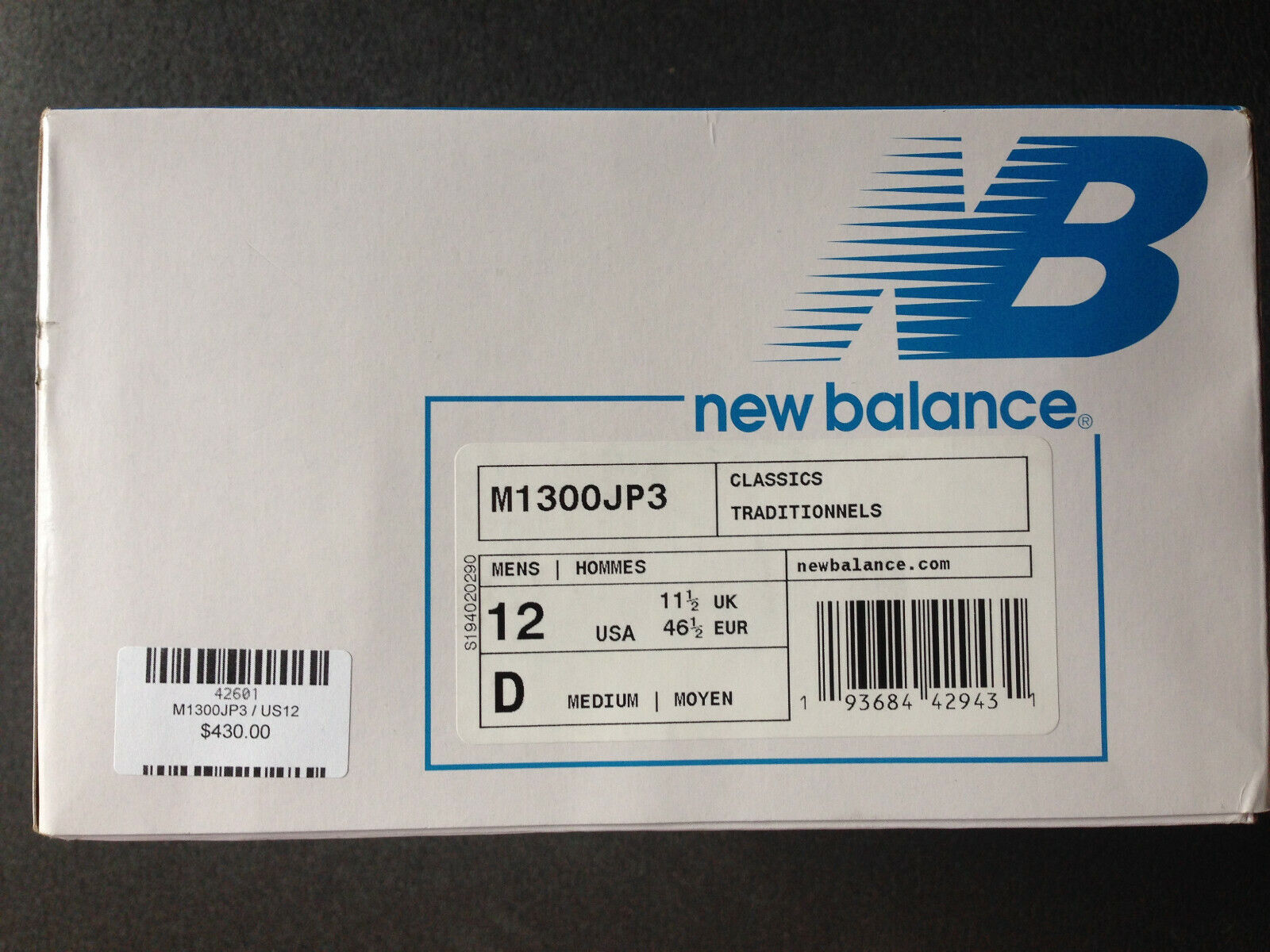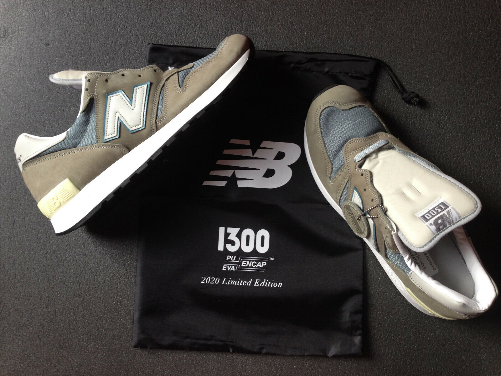 Australien  in der Größe US 12 (UK 11,5, EUR 46,5, CM 30) im "vintage colourway" an.  Die Schuhe sind neu, werden inclusive "Mortgage The House"-T-Shirt (Größe XL) und "Mortgage The House"-Tasche, sowie einem NB-M1300JP3-Schuhbeutel in der original Box versandt.