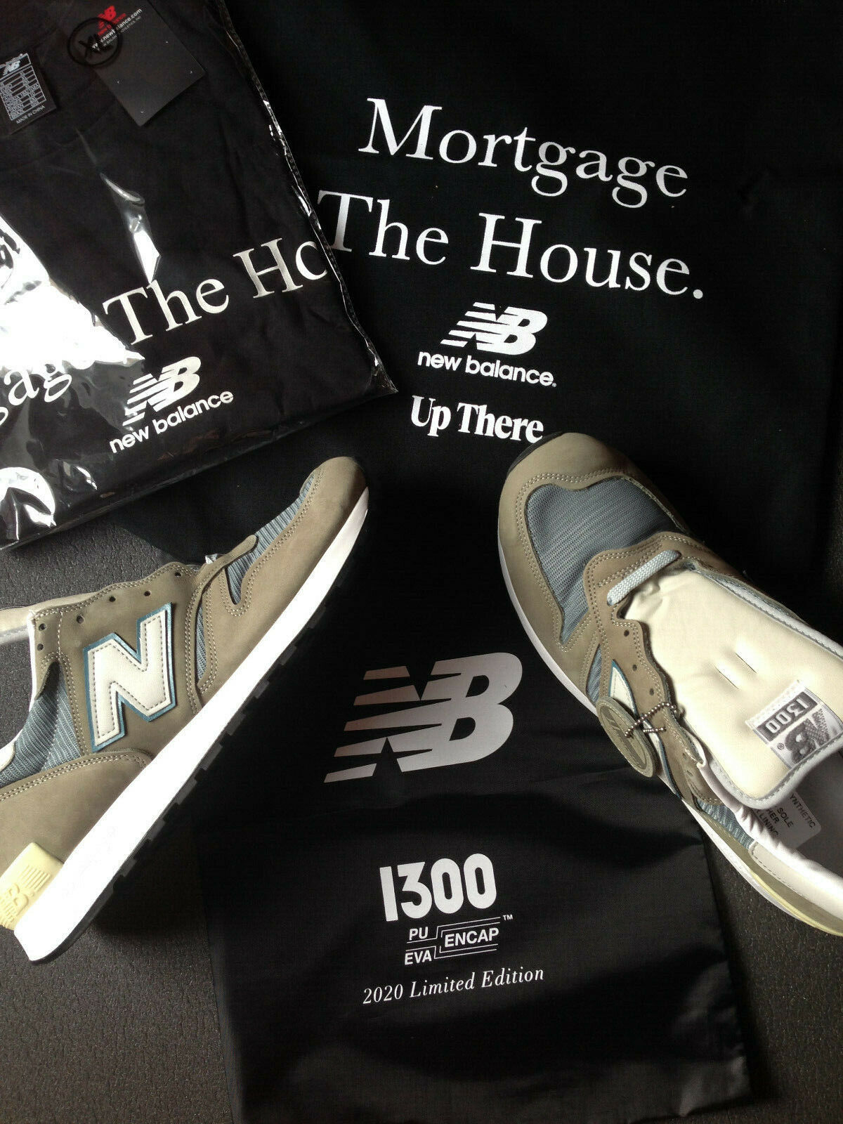 The shoes are new and comes including NB-M1300JP3-shoebag plus "Mortgage The House"-T-shirt (size XL) plus "Mortgage The House"-bag in the original box.