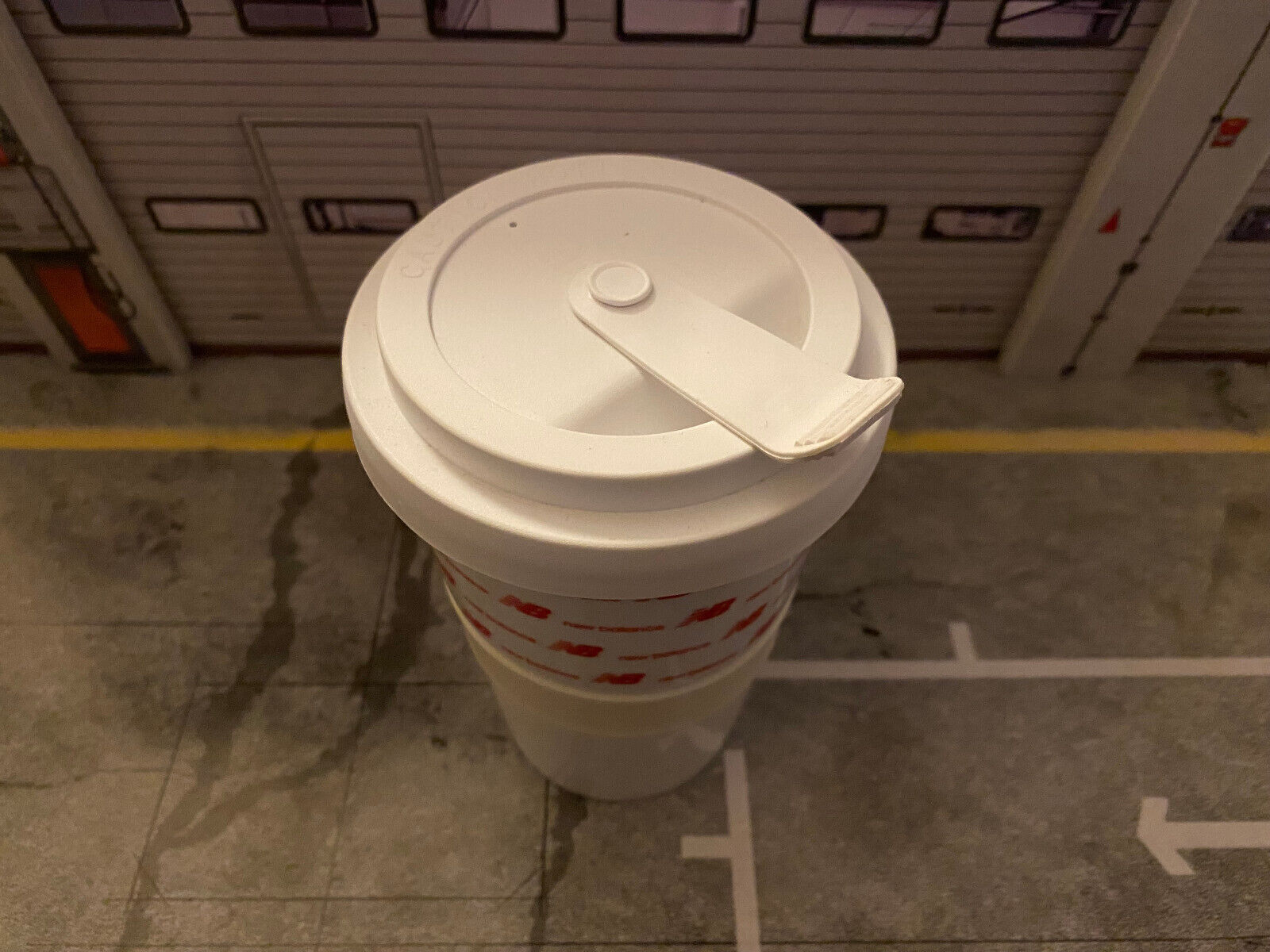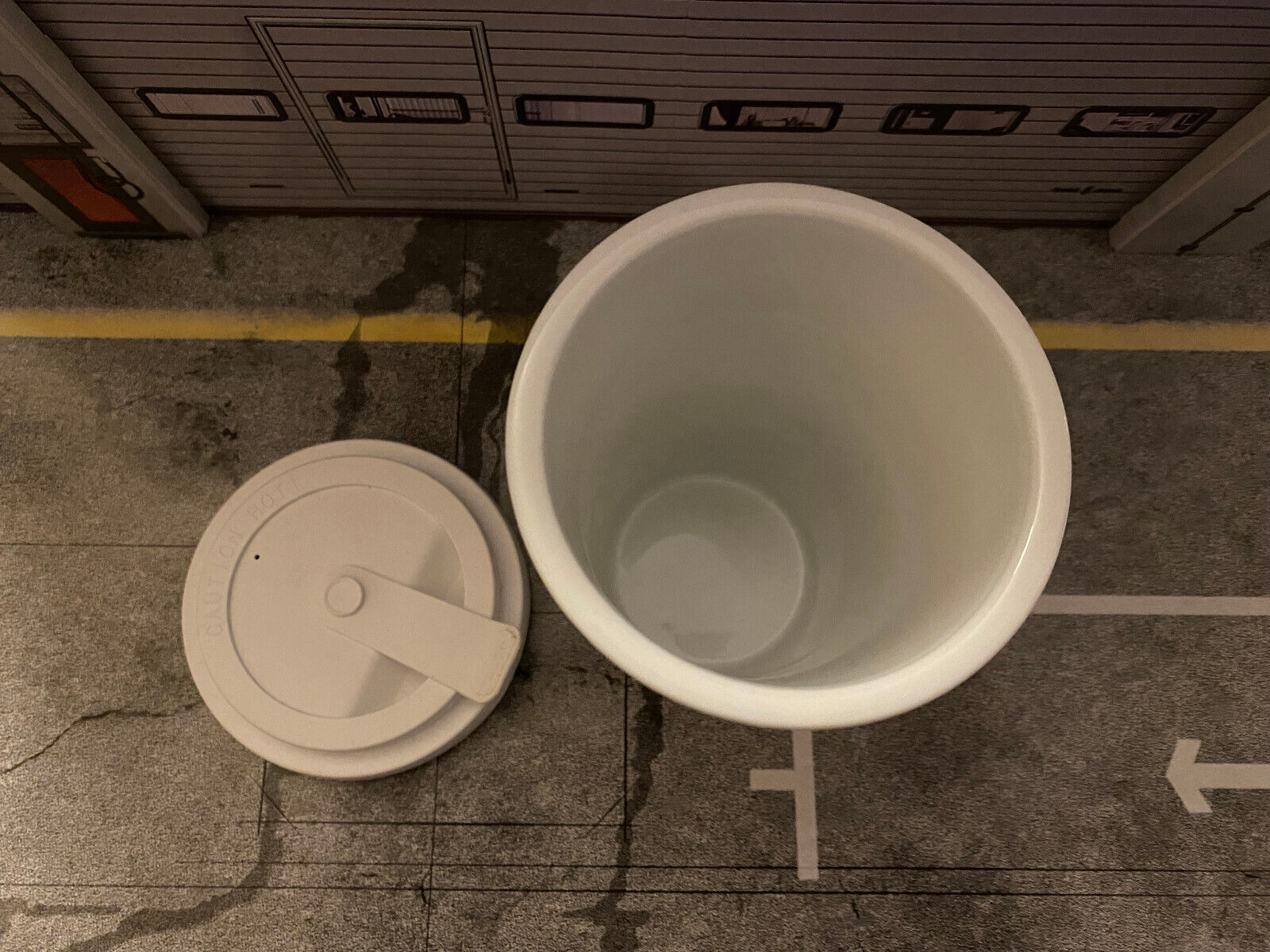 Der Becher ist aus Porzellan mit Silikon-Banderole (schützt vor Hitze) und Kunststoff-Elastomer-Deckel (silikonfrei) gefertigt und neu.