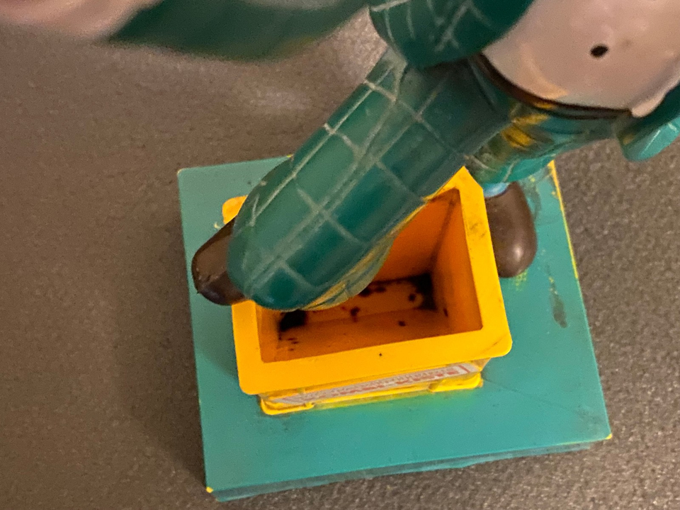 Die Figur stammt aus den 80er Jahren, ist gebraucht, verschmutzt, defekt, hat Alters-u. Lagerspuren und ist mit dem Sockel verschraubt.