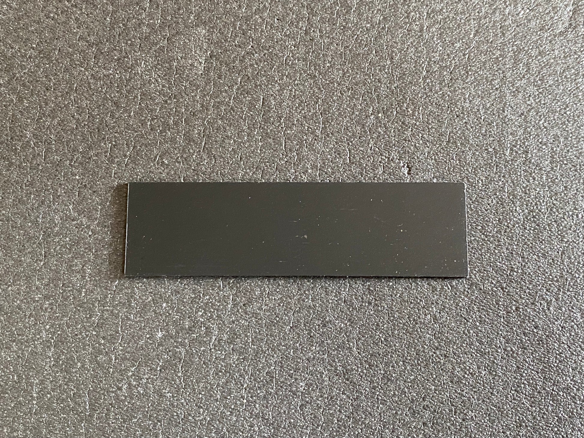 in der Größe 90 mm x 25 mm (Dicke 1,6 mm) in Silber mit schwarzer Schrift an.