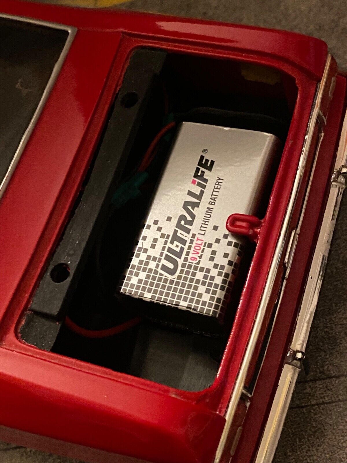 Bei dem hier angebotenen Modell wurden u.a. die Frontscheinwerfer, das Rundumlicht und die Heckleuchten mittels einer im Kofferraum unter dem abnehmbaren Kofferraumdeckel befindlichen 9 Volt-Blockbatterie auf Beleuchtung umgebaut, sowie ist die Antenne ausziehbar, die Felgen originalgetreu und die Stoßstangen mit schwarzen Rammschutzleisten lackiert.