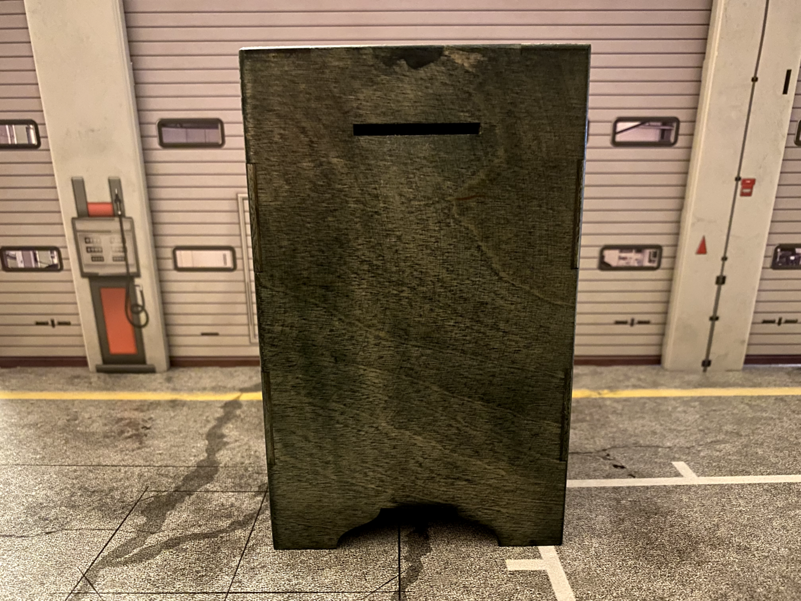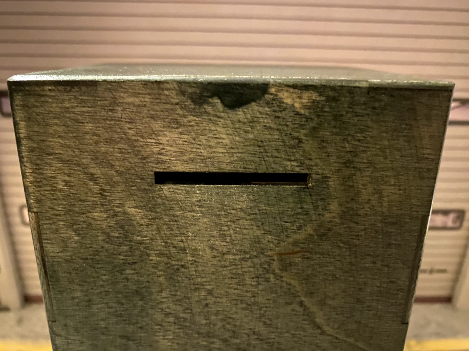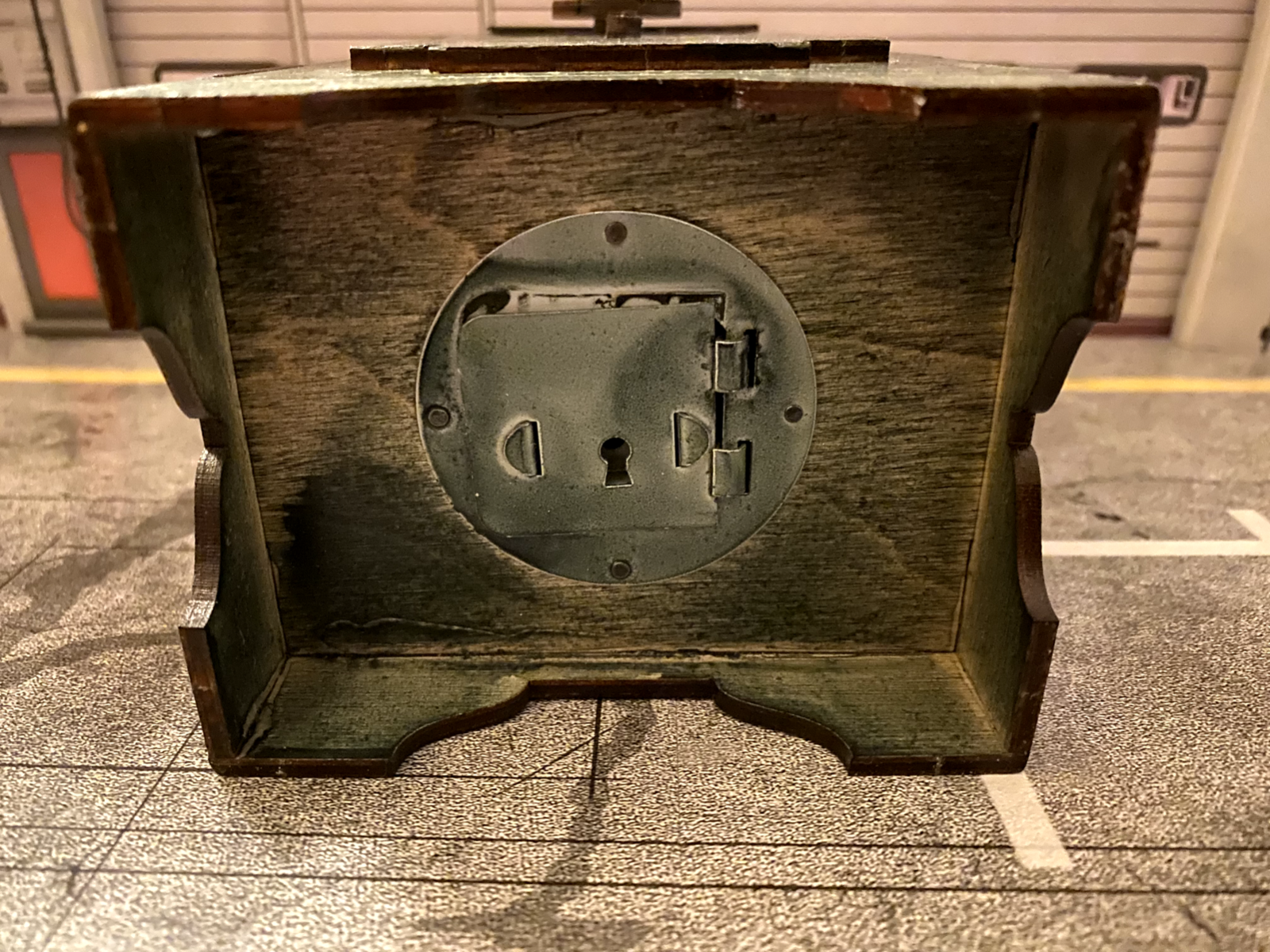 Die Spardose ist gebraucht, aus Holz gefertigt, die Maße sind ca. 16 cm x 9,5 cm x 7,5 cm (Höhe x Breite x Tiefe) und hat an der Unterseite eine Klappe welche durch den mitgelieferten Schlüssel geöffnet werden kann.