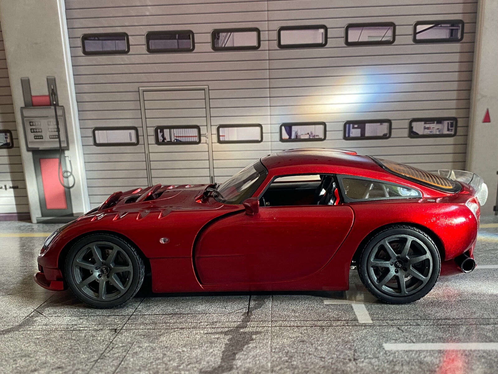 TVR Sagaris Rot Metallic Umbau auf Felgen Anthrazit + Auspuff Schwarz Matt 1:18